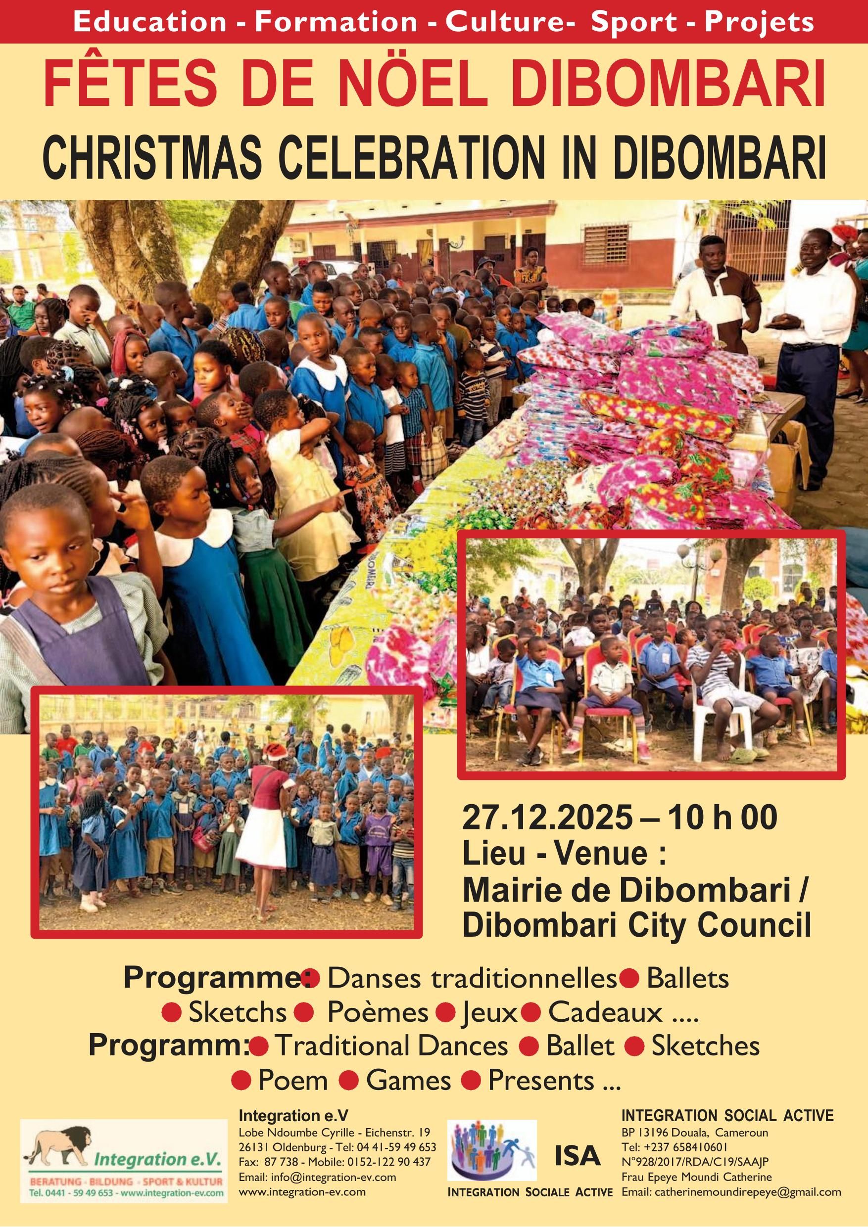 unser Verein Integration e. V. wird in diesem Jahr wieder zusammen mit unserem Partnerverein " Integration Sociale Active " in Kamerun ein Weihnachtsfest veranstalten. Es wird in dem in der Nähe von Duala liegenden Dorf Dibombari stattfinden. Dort betreuen wir die Kinder schon seit einigen Jahren mit unseren Projekten. Die meisten von ihnen sind mit ihren Eltern aus dem Bürgerkriegsgebiet im Westen des Landes geflüchtet. Zur Zeit sind es 379 Kinder.