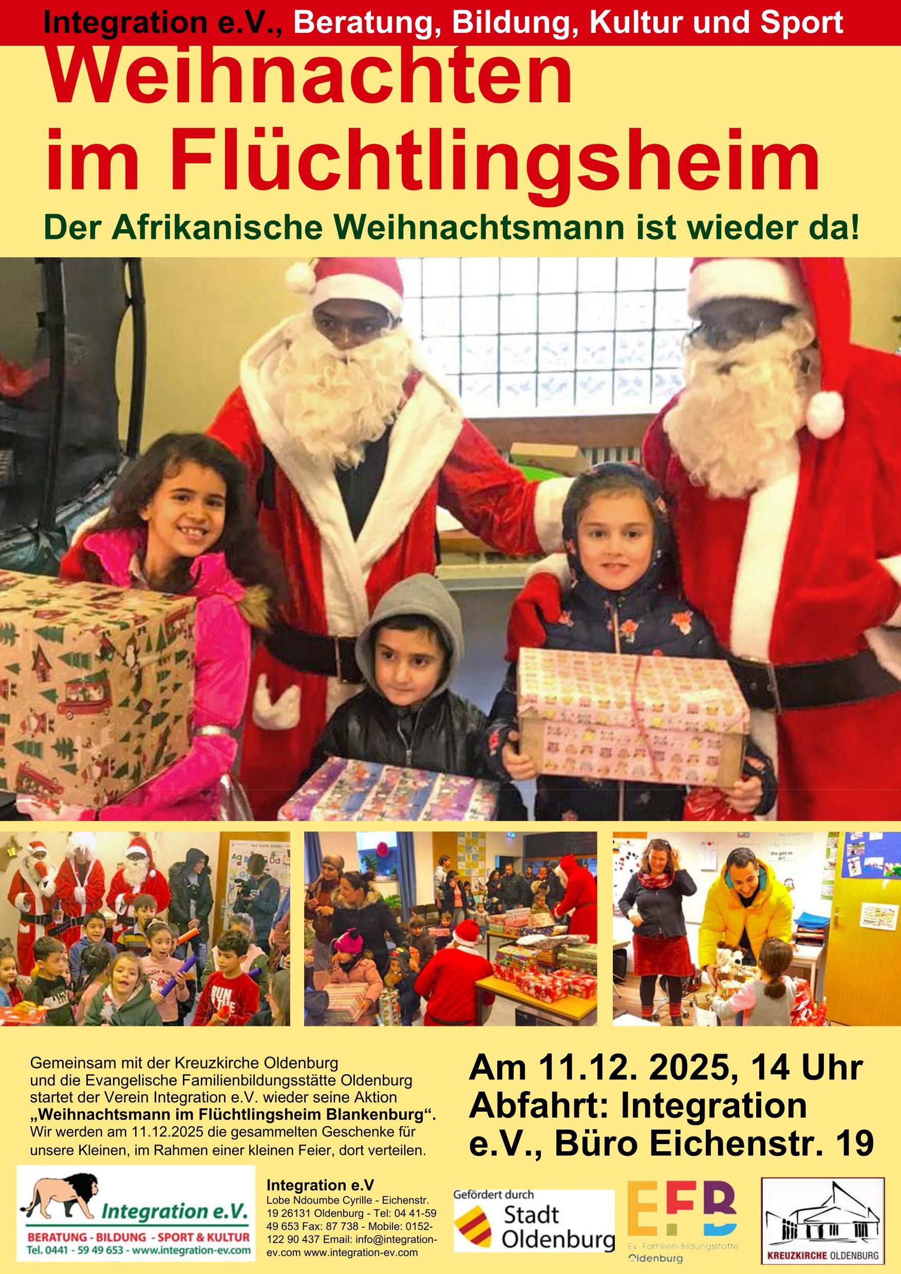 unser Verein Integration e. V. wir auch in diesem Jahr 2025 wieder in Zusammenarbeit mit der Kreuzkirchengemeinde Eversten und der Evangelischen Familienbildungsstätte Oldenburg im Kloster Blankenburg ein Weihnachtsfest mit Geflüchteten und ihren Familien veranstalten. Am Mittwoch, den 11. Dezember ´25, werden wir uns gegen 14.00 Uhr beim Büro des Vereines in der Eichenstraße 19 treffen, um von dort aus gemeinsam nach Kloster Blankenburg zu fahren. Nach der Ankunft werden die Geschenke an die Sozialarbeiter übergeben, welche diese danach im Gemeinschaftsraum den Familien und ihren Kindern verschenken. Für alle werden kostenlos Getränke, Snacks und Süßigkeiten angeboten.