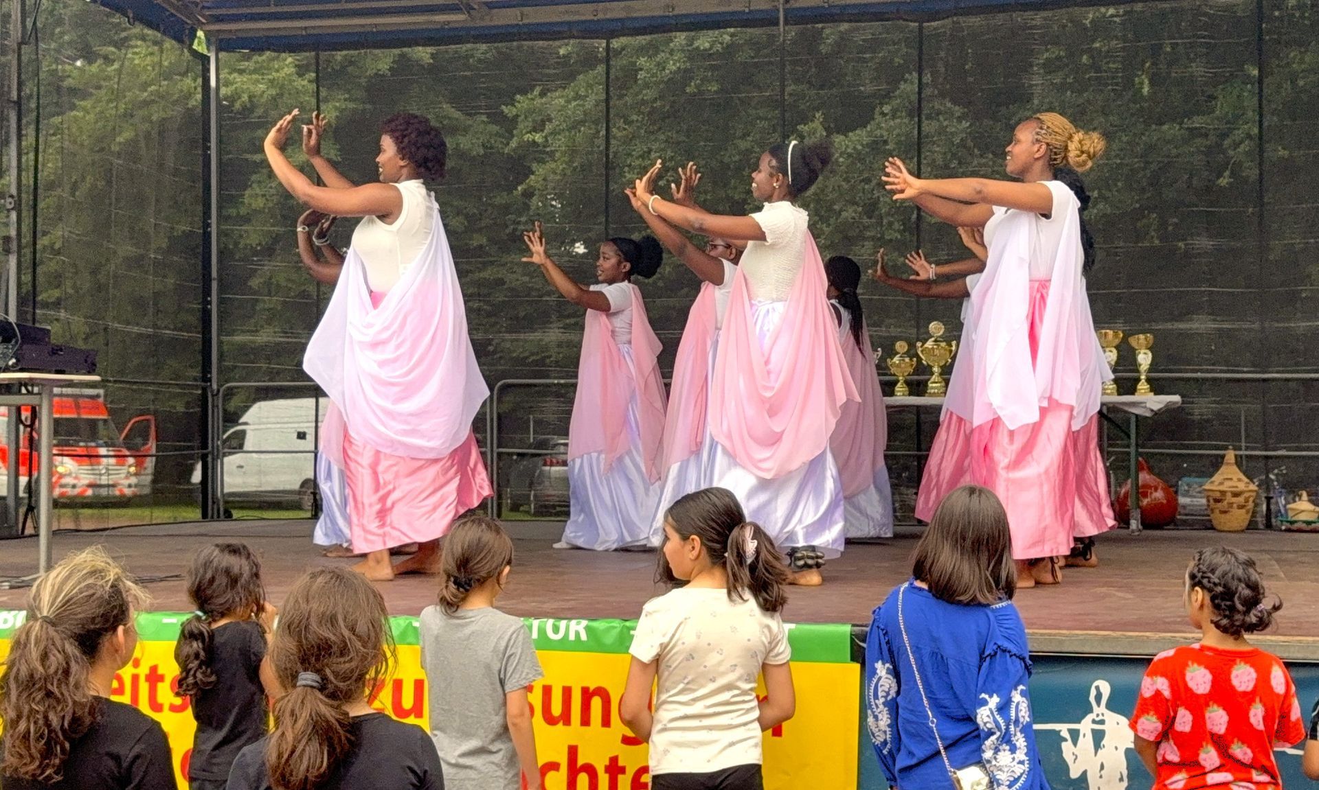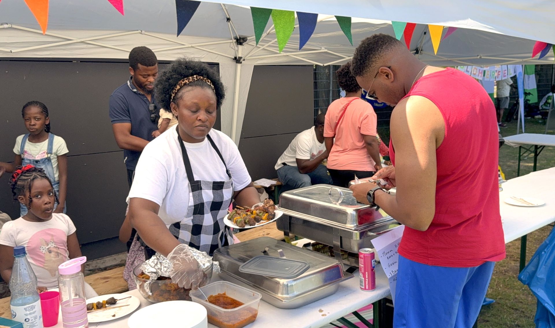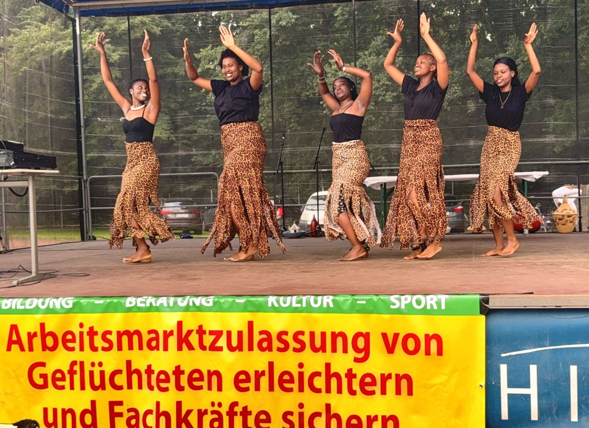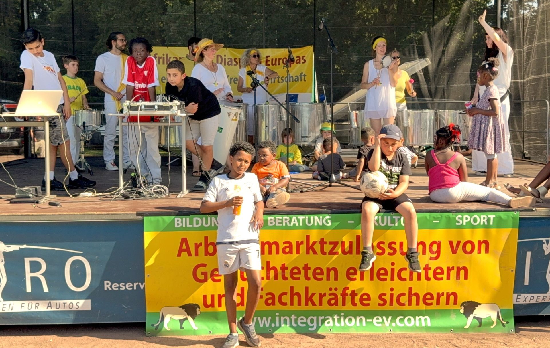 Das kulturelle Programm ist wieder durch Musik, Tanz und interkulturelle Gastronomie abgerundet worden. Der DJ Skaymusik hat wir Musik gesorgt. Es gab Auftritte der Tanzgruppe aus Burundi und Ruanda " Akaranga k´ iwacu ". Die Länder Elfenbeinküste, Gambia, Ghana, Kamerun, Namibia, Nigeria und Simbabwe habe ihre landestypischen Speisen mit Buffets angeboten. Die Kinder, besonders die kleineren, haben sich auf zwei Hüpfburgen austoben können. Eine Schminkfee hat die Gesichter der Kleinen hübsch bemalt. Auf den Infoständen hat unter anderen auch der Verein Integration e. V. ausführliche Informationen und Broschüren zu dem Europa-Projekt EurAdice ( Afrikanische Diaspora Europas für eine inklusive Kreislaufwirtschaft ) angeboten. Außerdem haben wir Info-Stände für unser Patenschafts-Programm aufgestellt.