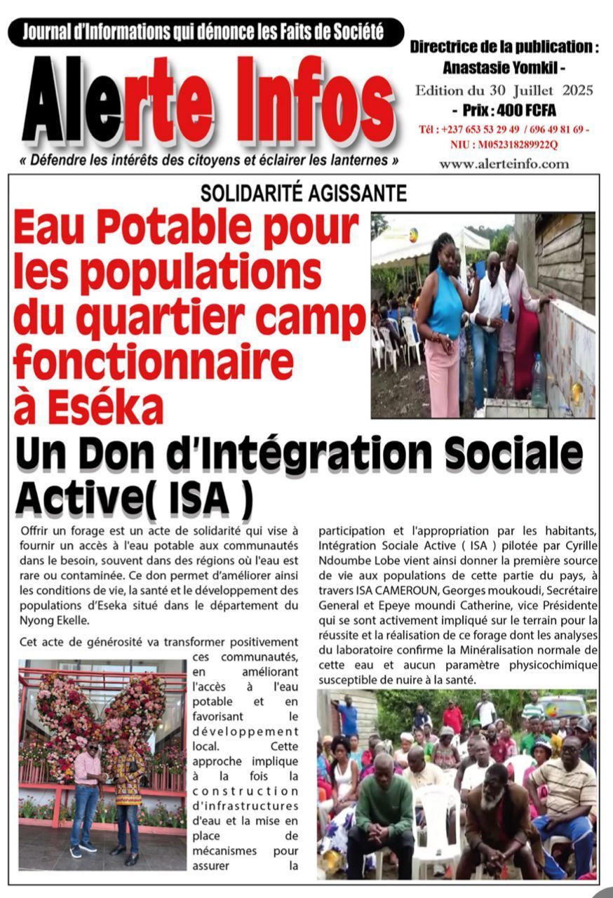 Der von Cyrille Lobe Ndoumbe geleitete Verein Integration e. V. gibt als Schirmherr des Projektes den Menschen in diesem Teil des Landes die erste Lebensquelle, Wasser. Der Generalsekretär von ISA CAMEROUN, Herr Georges Moukoudi und Frau Epeye Moundi Catherine, Vizepräsidentin, haben sich aktiv vor Ort für den Erfolg und die Realisierung dieser Bohrung eingesetzt. Sie haben bestätigt, dass die Laboranalysen ergeben haben, dass eine normale Mineralisierung des Wassers und keine physikochemischen Parameter vorliegen, welche die Gesundheit beeinträchtigen könnten.