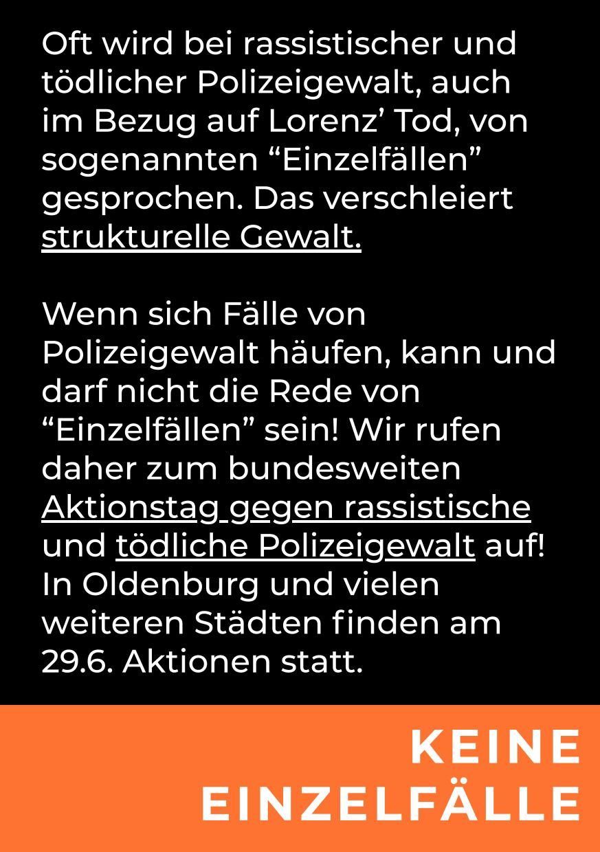 Wir möchten ein ehrendes Andenken an Lorenz pflegen und Zeichen setzen gegen die zunehmende Gewalt bei Polizeieinsätzen.