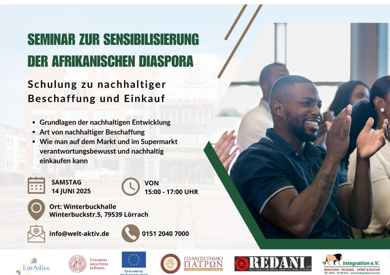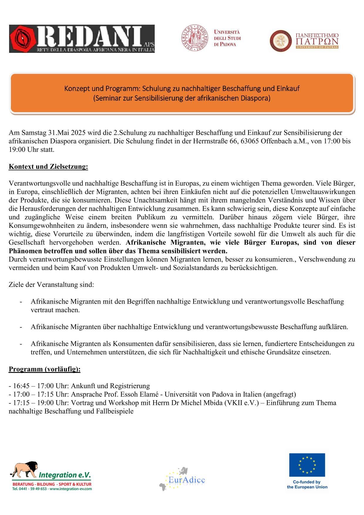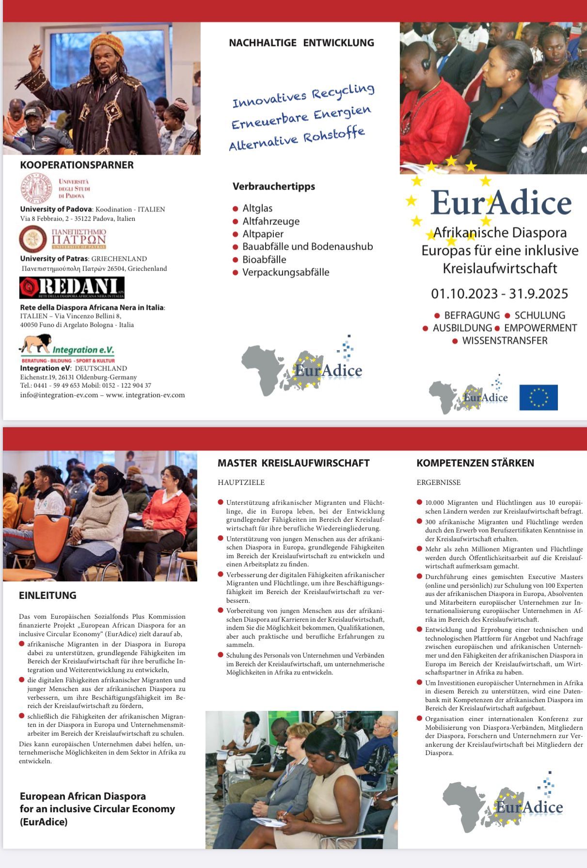 wir freuen uns Ihnen mitteilen zu können, dass das Projekt EurAdice ( Afrikanische Diaspora Europas für eine inklusive Kreislaufwirtschaft ) nun zum Abschluss kommt. Aus diesem Anlass wird es am 01. , 02., 03. und 4. Oktober 2025 in Padua / Italien eine große Abschlussveranstaltung mit Vorträgen und Gala geben.