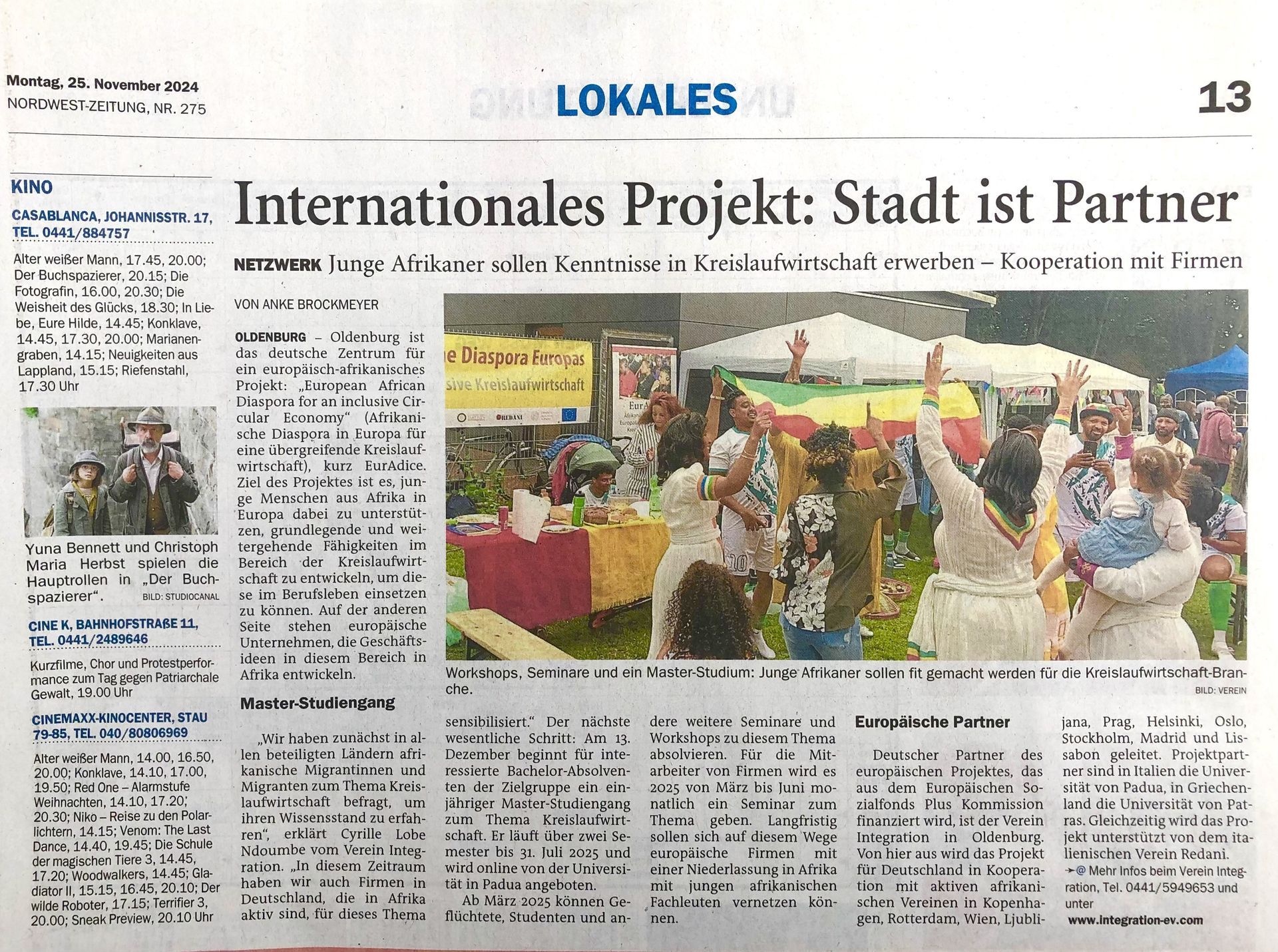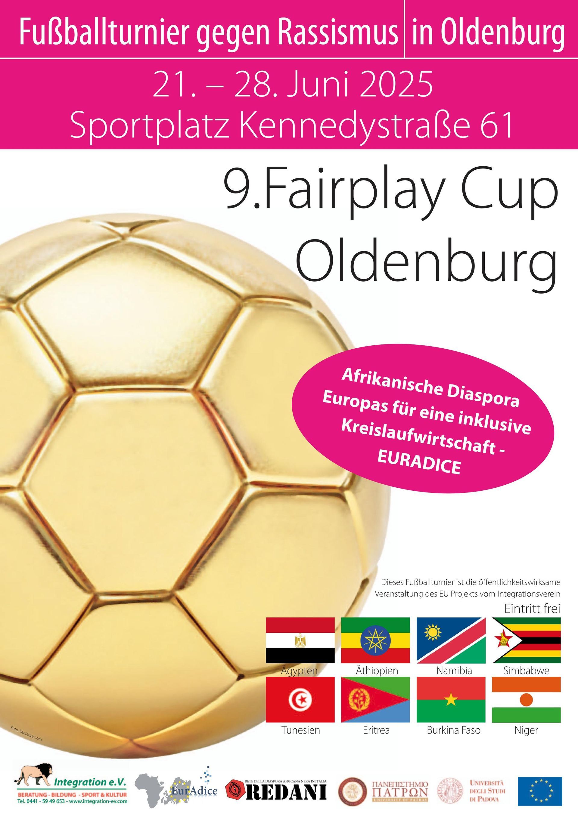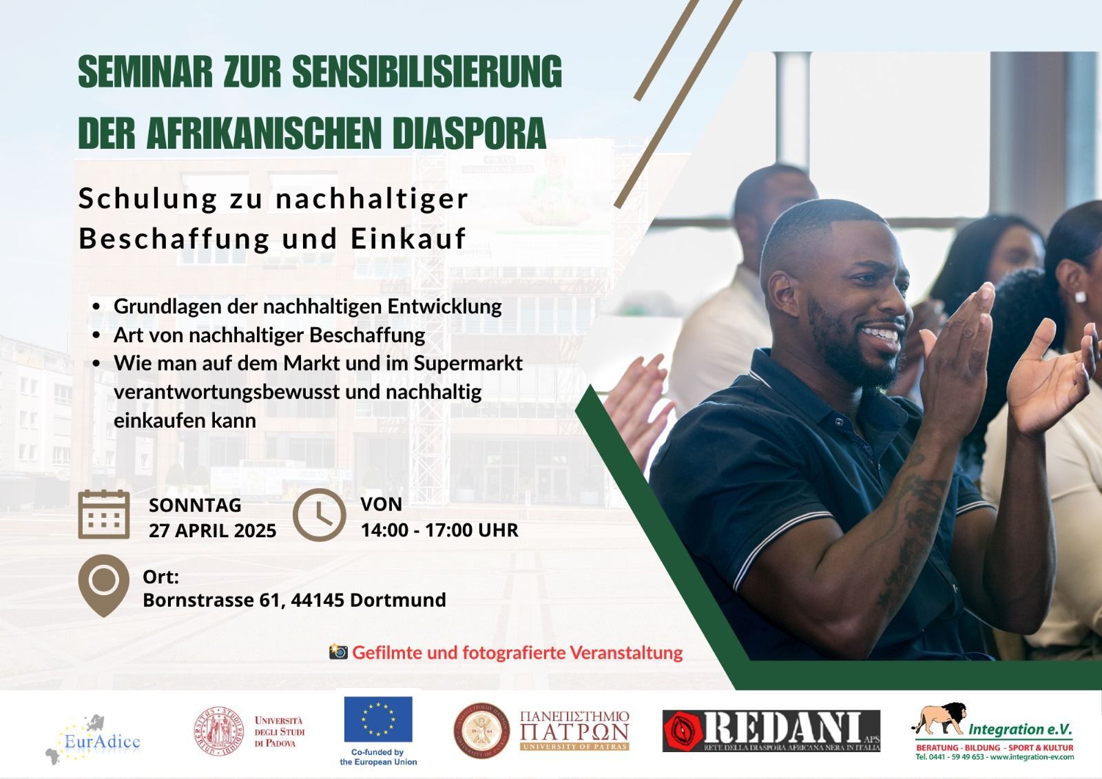 wir freuen uns Ihnen mitteilen zu können, dass das Projekt EurAdice ( Afrikanische Diaspora Europas für eine inklusive Kreislaufwirtschaft ) nun zum Abschluss kommt. Aus diesem Anlass wird es am 01. , 02., 03. und 4. Oktober 2025 in Padua / Italien eine große Abschlussveranstaltung mit Vorträgen und Gala geben.