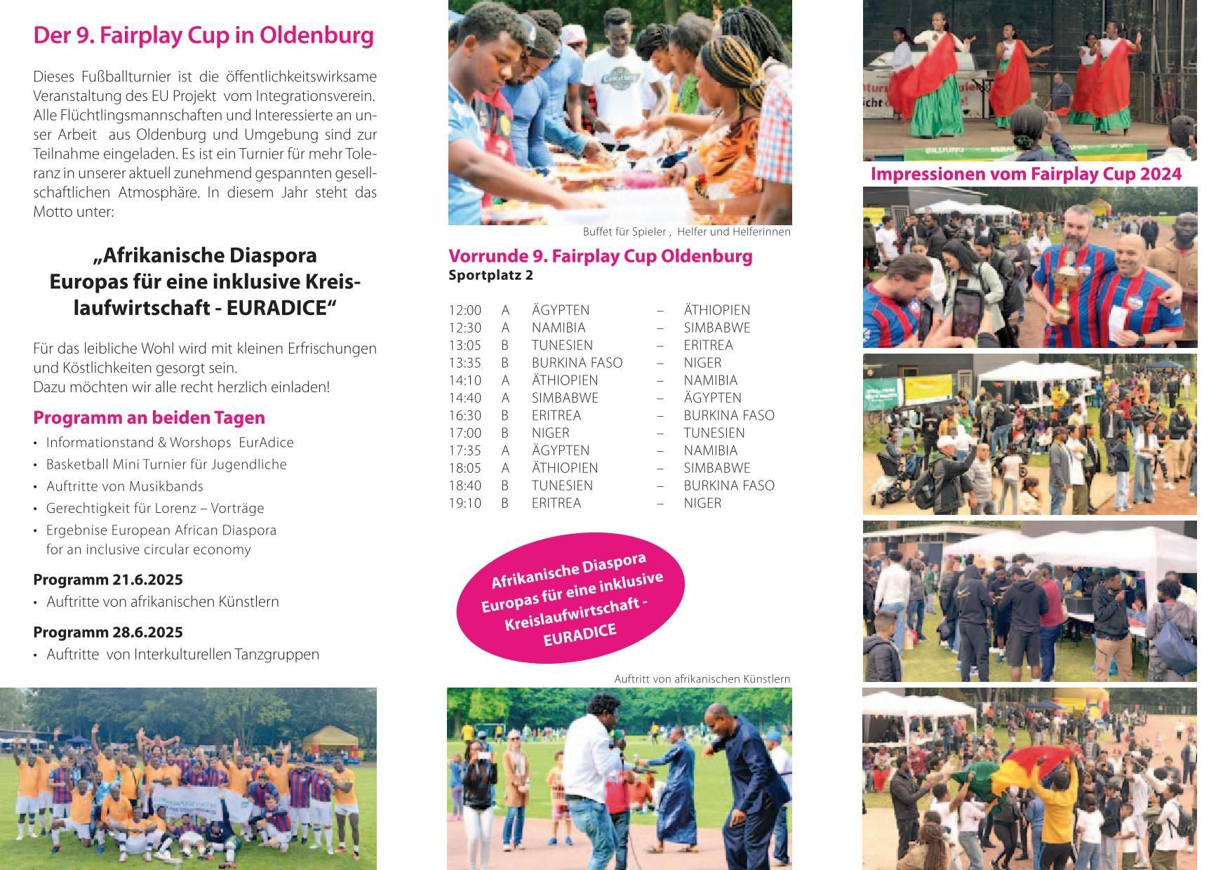 Wir werden an diesen beiden Tagen das EurAdice -Projekt der Öffentlichkeit vorstellen, die Ergebnisse der vergangenen zwei Jahre präsentieren, eine Diskussionsrunde und einen workshop anbieten " Perspektiven für die Afrikanische Wirtschaft auf dem Afrikanischen Kontinent " . Durch diesen Prozess werden dort viele Arbeitsplätze geschaffen werden. Um unsere afrikanische Community zu erreichen, haben wir ein Fussballturnier gegen Rassismus organisiert. Dieses wird begleitet von einem bunten Kulturprogramm, Tanz, Musik, Spiele und Hüpfburgen für Kinder. Ein interkulturelles Büfett und Getränke werden für das leibliche Wohl sorgen.