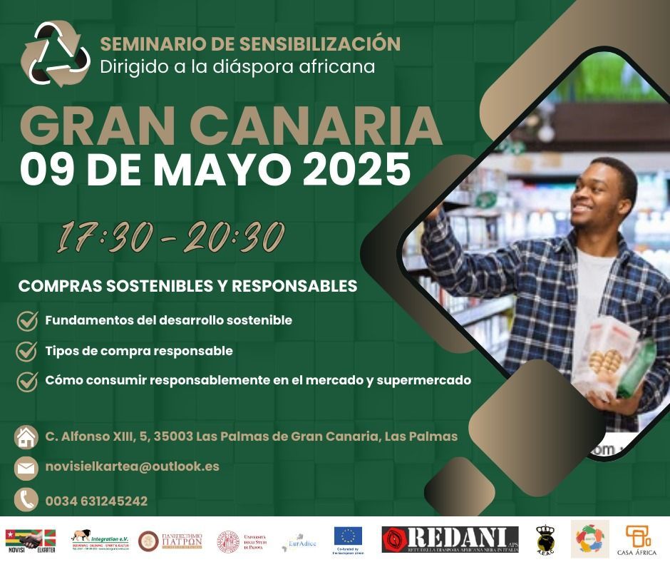 im Rahmen unseres EurAdice-Projektes (Afrikanische Diaspora Europas für eine inklusive Kreislaufwirtschaft) in Kooperation mit unseren Partnervereinen finden parallel am 09. Mai 2025 von 17:30 bis 20:30 Uhr in Gran Canaria, C Alfonso XIII,5, 35003 Las Palmas de Gran Canaria, und in Centro Civico de Canrull , Carrer de Sant Isidor 51 Barcelona zwei Seminare statt.