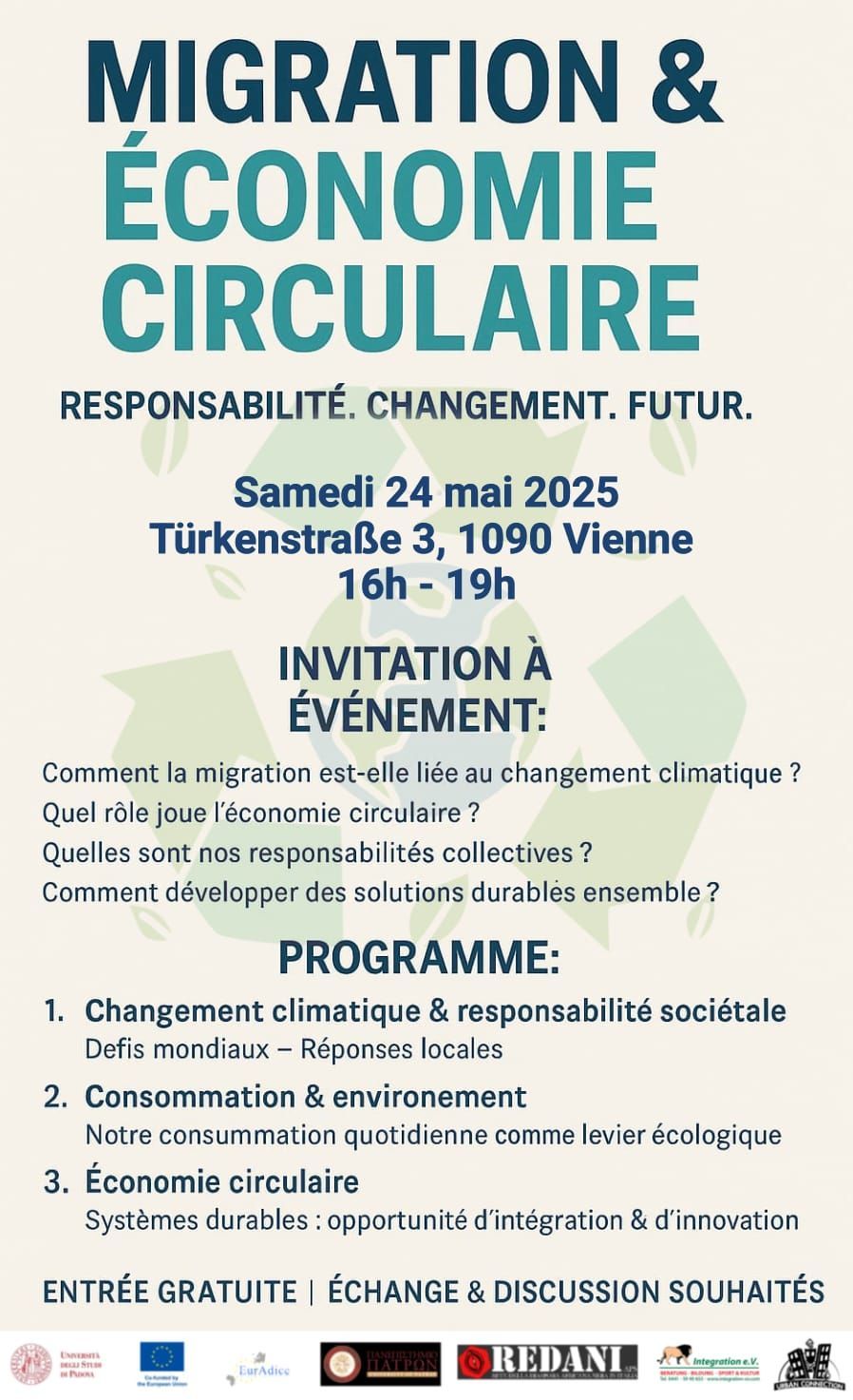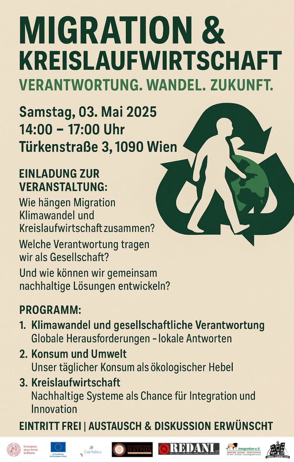 Das dritte Seminar, ebenfalls mit unserem Partner in Wien, Verein Urban Connection Verein für Medien, findet am 03. Mai 2025 von 14:00 Uhr bis 17:00 Uhr in der Türkenstraße 3, 1090 Wien, Österreich statt. Gegenstand der Diskussion wird Folgendes sein: Welche Verknüpfungen bestehen zwischen Migration, Klimawandel und Kreislaufwirtschaft?