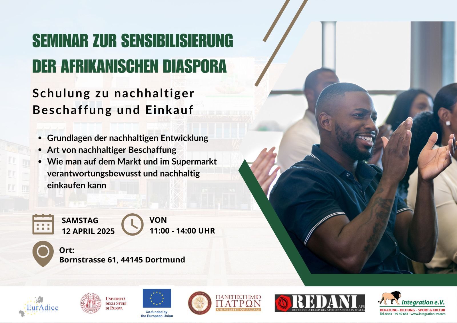 im Rahmen unseres EurAdice-Projektes (Afrikanische Diaspora Europas für eine inklusive Kreislaufwirtschaft) in Kooperation mit unseren Partnervereinen werden in Kürze drei Seminare stattfinden.