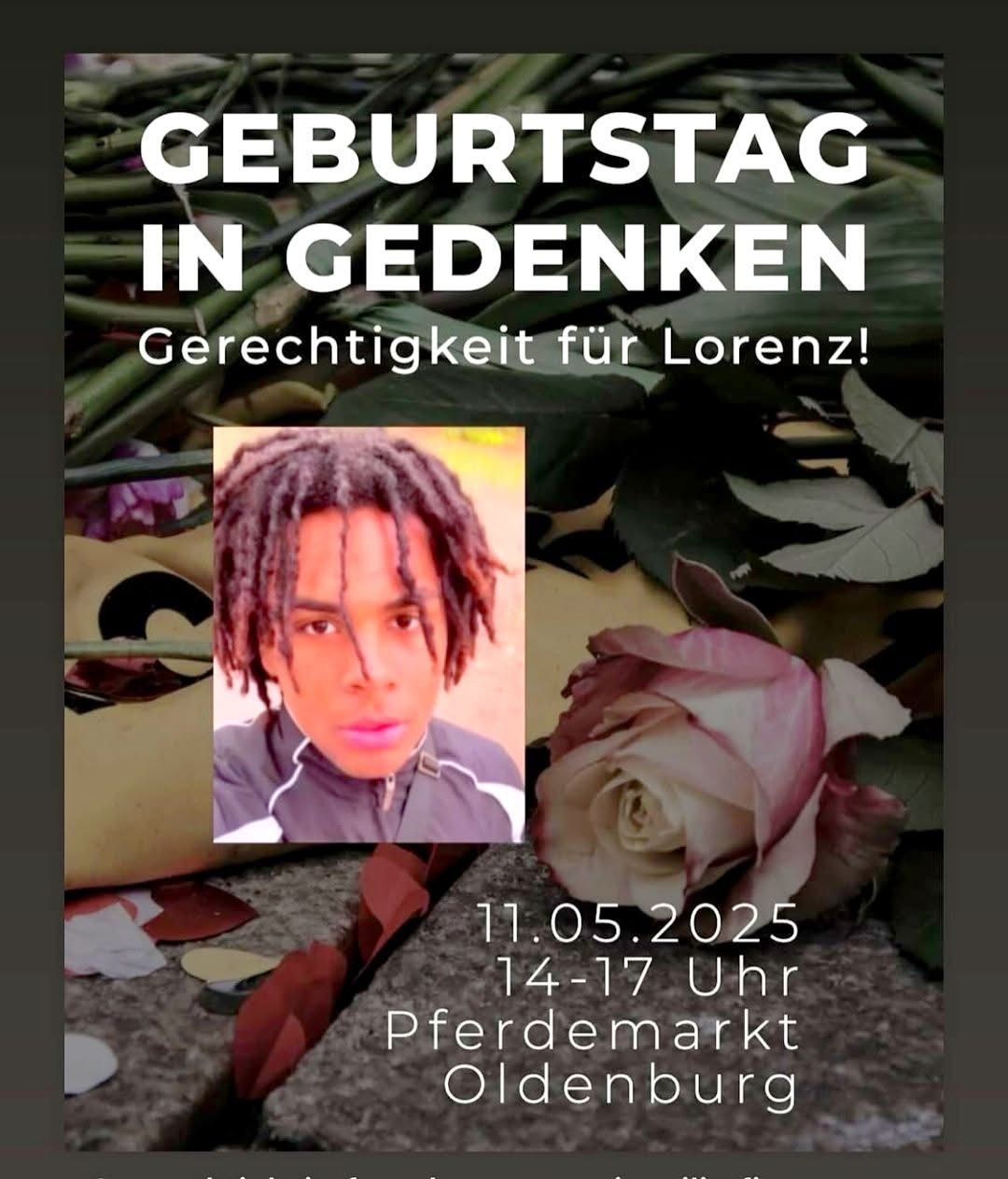 die Initiative " Gerechtigkeit für LORENZ ! " hat am Sonntag, den 11. Mai ´25 auf dem Pferdemarkt in Oldenburg ab 14.00 Uhr eine Veranstaltung zum Gedenken an den 22. Geburtstag von LORENZ veranstaltet. Bei den etwa 1.000 Teilnehmern ist auch die Familie von LORENZ mit dabei gewesen.
