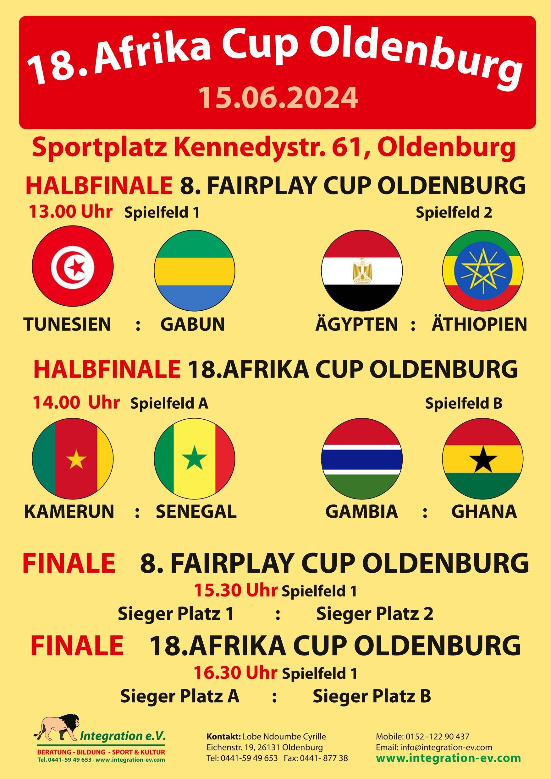 Wir laden alle Interessierte ein, um an den Endspielen um den Fairplay Cup Oldenburg am Samstag, den 15. Juni ´24 ab 13.00 Uhr und den Afrika - Cup ´24 ab 14.00 Uhr auf den Sportplätzen an der Kennedystraße, teilzunehmen. Das Endspiel für den Fairplay Cup ´24 wird ab 15.30 Uhr, und das Endspiel um den Afrika-Cup ´24 wird ab 16.30 Uhr, beide auf dem Spielfeld Nr. eins, stattfinden.