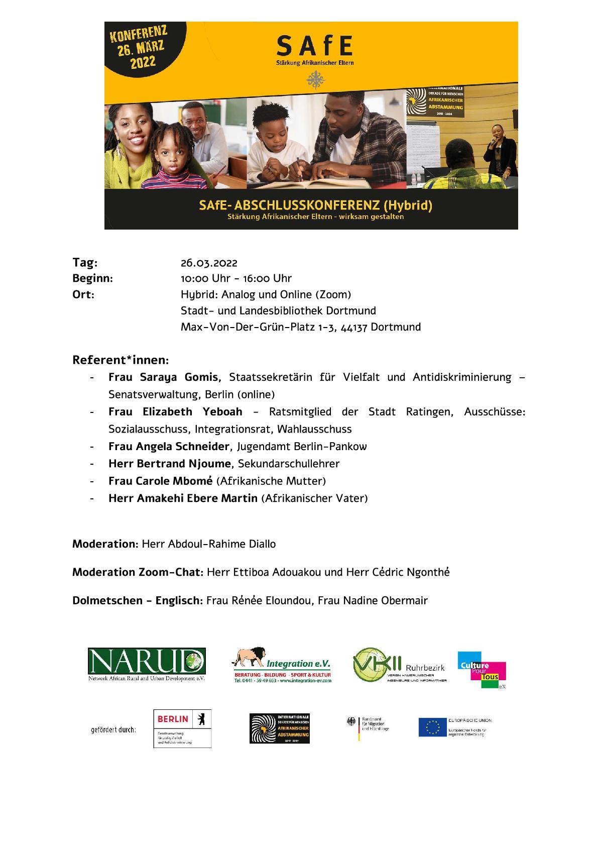 Einladung zur SAfE-Abschlusskonferenz: "Stärkung Afrikanischer Eltern - wirksam gestalten" Am Samstag, den 26. März 2022 von 10:00–16:00 Uhr In der Stadt- und Landesbibliothek Dortmund / Max-Von-Der-Grün-Platz 1-3, 44137 Dortmund Anmeldung unter: konferenz@narud.org