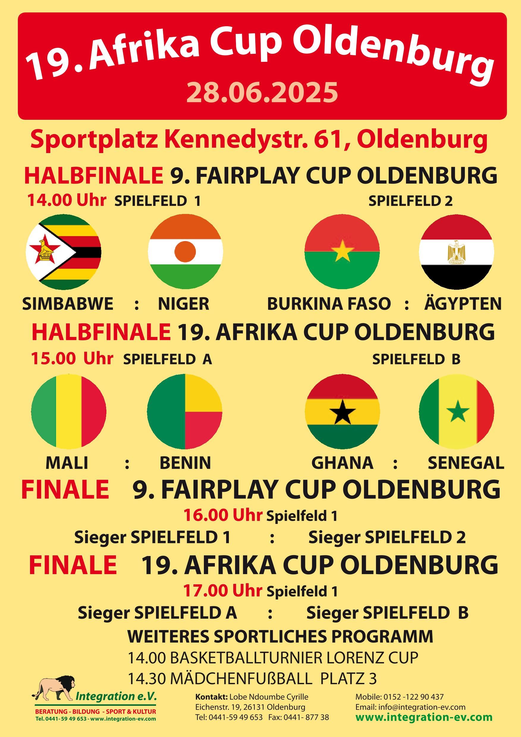 Am 28. Juni ´25 hat der zweite Teil von unserem diesjährigen Fußballturnier gegen Rassismus, der Afrika-Cup 2025 mit Fairplay Cup Oldenburg ´25, stattgefunden. Zusätzlich gab es das Turnier für Mädchen, das Mick-Turnier und die Spiele im 1. Basketballturnier, den LORENZ-CUP. Die Spiele, die wieder auf den Sportplätzen an der Kennedystraße ausgetragen wurden, haben diesmal um 14.00 Uhr begonnen. Im Halbfinale vom Fairplay-Cup Oldenburg haben gespielt Niger gegen Simbabwe mit 1 : 0 und Ägypten gegen Burkina Faso mit 5 : 3. Im Finale konnte Ägypten durch Elfmeterschießen Niger mit 4 : 2 Toren besiegen. Im Halbfinale um den Afrika-Cup ´25 spielten Benin gegen Mali 2 : 1 und Senegal gegen Ghana durch Elfmeterschießen 6 : 5. Im Endspiel um den 19. Afrika-Cup gelang es der Mannschaft aus Benin das Team aus Senegal ebenfalls durch Elfmeterschießen mit 7 : 6 Toren zu bezwingen. Afrika-Cup Meister ist 2025 das Team aus Benin !