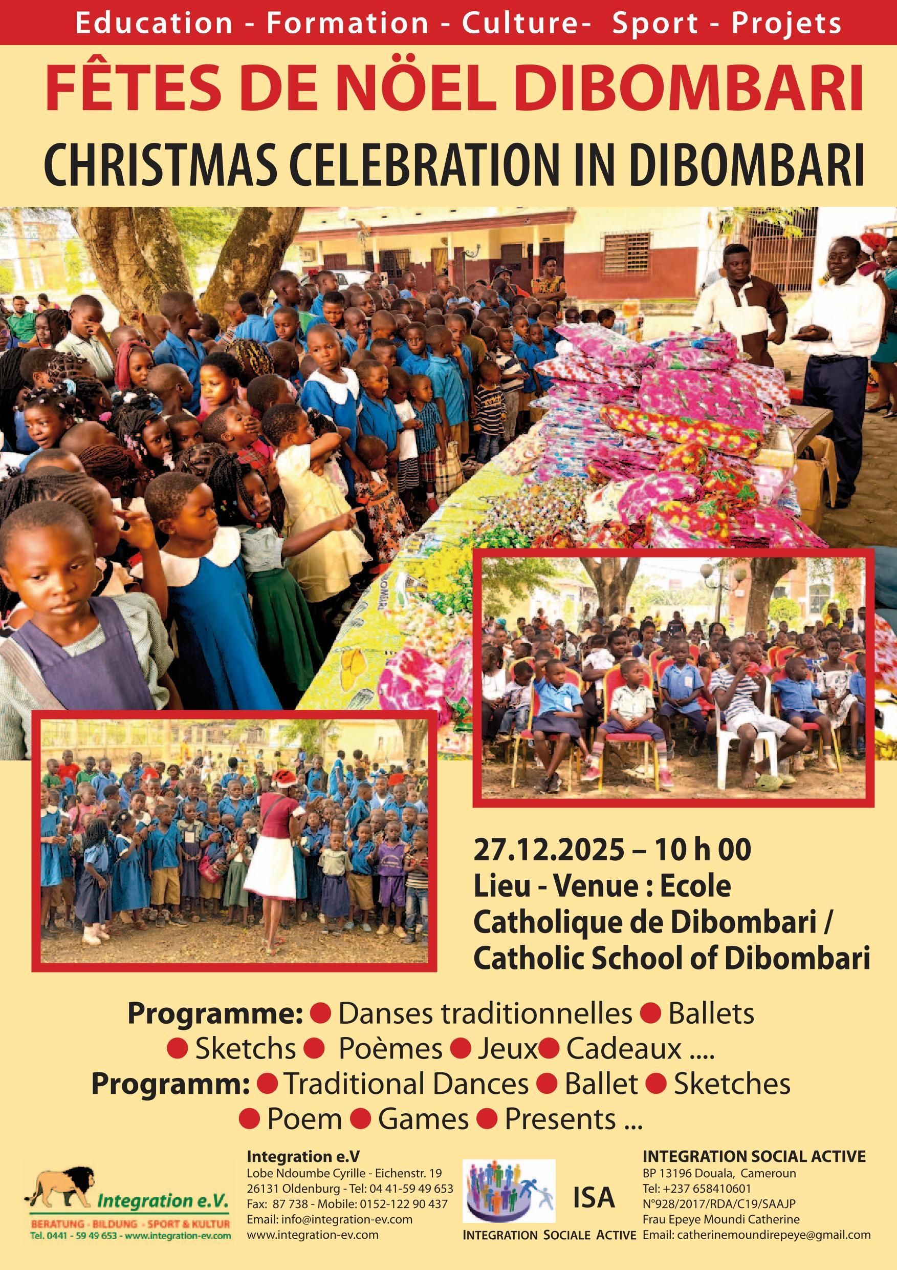 Am Samstag, den 27. Dezember 2026 haben die Vereine Integration e. V. und Integration Social Active für die etwa 400 Kinder des Dorfes Dibombari eine Weihnachtsfeier veranstaltet. Bei Sonnenschein und hohen Temperaturen haben die Jungen und Mädchen auf den Stühlen unter zwei großen Pavillons, die vor dem katholischen Schulgebäude aufgestellt worden sind, Platz genommen.