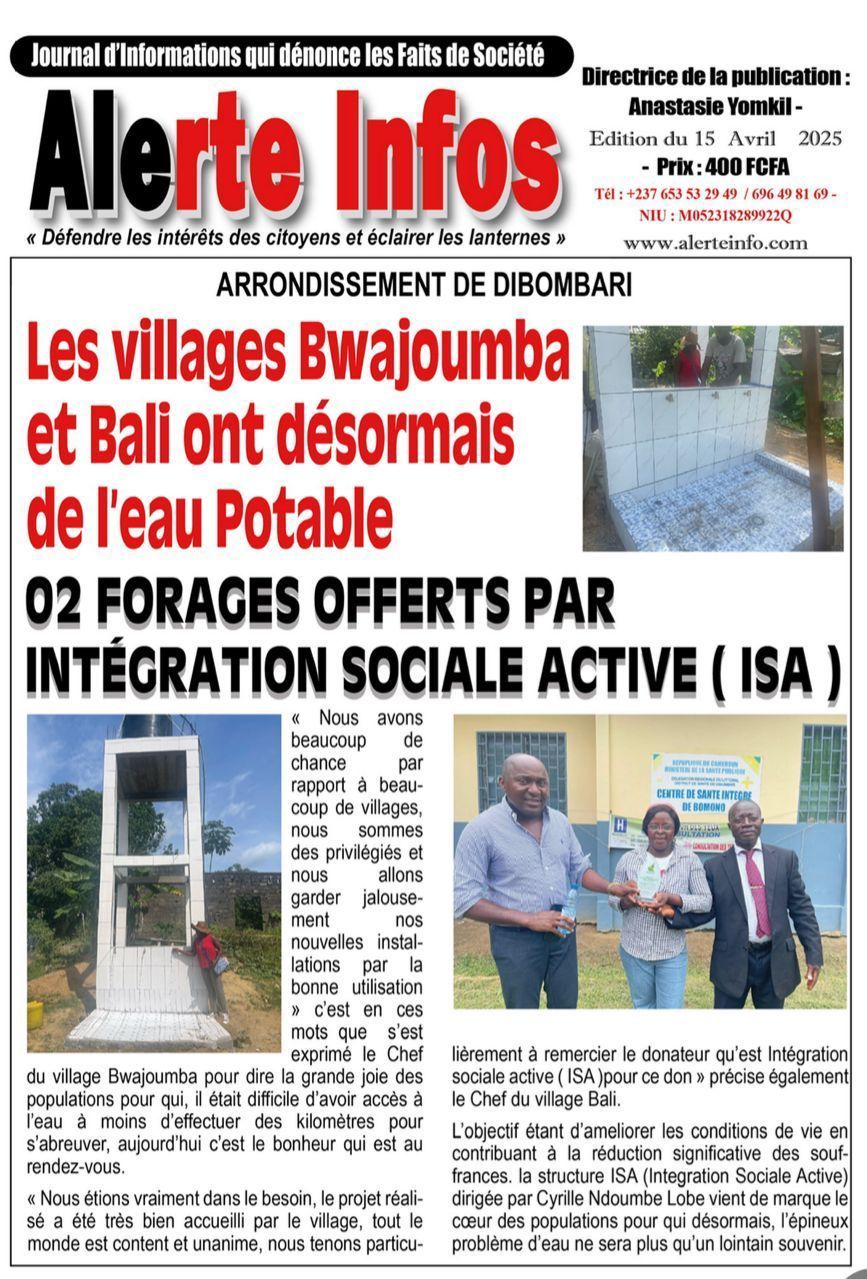 Der von Cyrille Lobe Ndoumbe geleitete Verein Integration e. V. gibt als Schirmherr des Projektes den Menschen in diesem Teil des Landes die erste Lebensquelle, Wasser. Der Generalsekretär von ISA CAMEROUN, Herr Georges Moukoudi und Frau Epeye Moundi Catherine, Vizepräsidentin, haben sich aktiv vor Ort für den Erfolg und die Realisierung dieser Bohrung eingesetzt. Sie haben bestätigt, dass die Laboranalysen ergeben haben, dass eine normale Mineralisierung des Wassers und keine physikochemischen Parameter vorliegen, welche die Gesundheit beeinträchtigen könnten.
