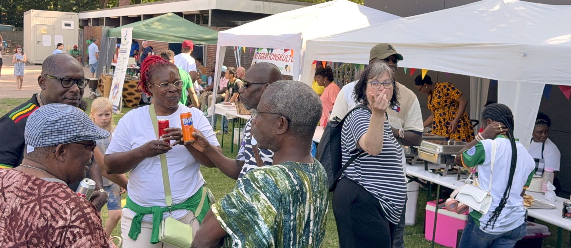 Das kulturelle Programm ist wieder durch Musik, Tanz und interkulturelle Gastronomie abgerundet worden. Der DJ Skaymusik hat wir Musik gesorgt. Es gab Auftritte der Tanzgruppe aus Burundi und Ruanda " Akaranga k´ iwacu ". Die Länder Elfenbeinküste, Gambia, Ghana, Kamerun, Namibia, Nigeria und Simbabwe habe ihre landestypischen Speisen mit Buffets angeboten. Die Kinder, besonders die kleineren, haben sich auf zwei Hüpfburgen austoben können. Eine Schminkfee hat die Gesichter der Kleinen hübsch bemalt. Auf den Infoständen hat unter anderen auch der Verein Integration e. V. ausführliche Informationen und Broschüren zu dem Europa-Projekt EurAdice ( Afrikanische Diaspora Europas für eine inklusive Kreislaufwirtschaft ) angeboten. Außerdem haben wir Info-Stände für unser Patenschafts-Programm aufgestellt.