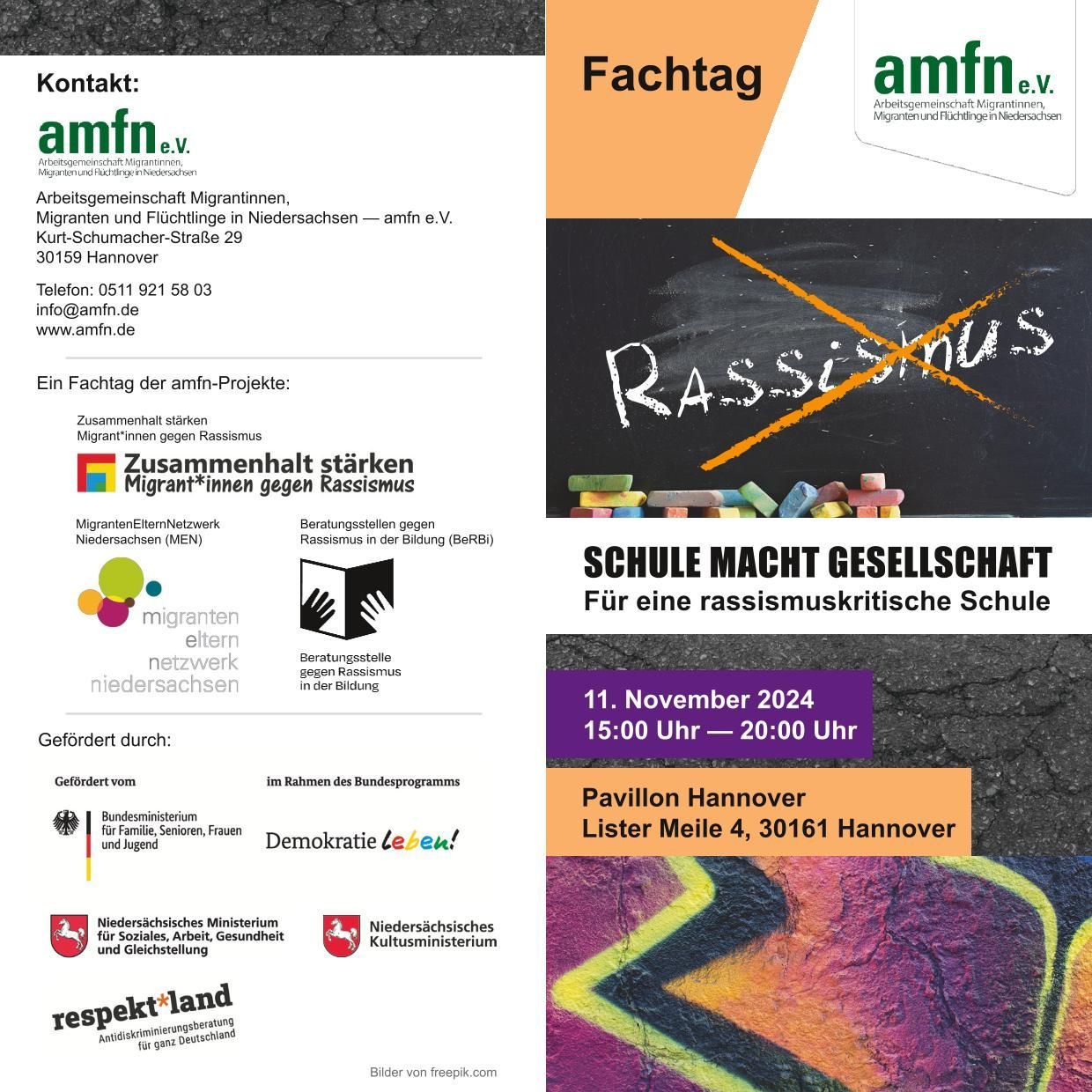 am 11. November 2024 veranstalten wir, Integration e. V. , in Zusammenarbeit mit amfn e. V. in Hannover eine Fachtagung mit dem Titel " Schule macht Gesellschaft ", für eine rassismuskritische Schule. Das Treffen wird stattfinden von 15.00 Uhr bis 20.00 Uhr beim Pavillon Hannover, Lister Meile 4. Wir laden alle Interessierte ganz herzlich zur Teilnahme ein. Auf dieser Tagung wird man sich eingehend mit den Problemen des Rassismus im Bildungssystem der Bundesrepublik beschäftigen. Durch das Programm wird Frau Sabine Rahimi als Moderatorin führen. Es wir folgende workshops geben: